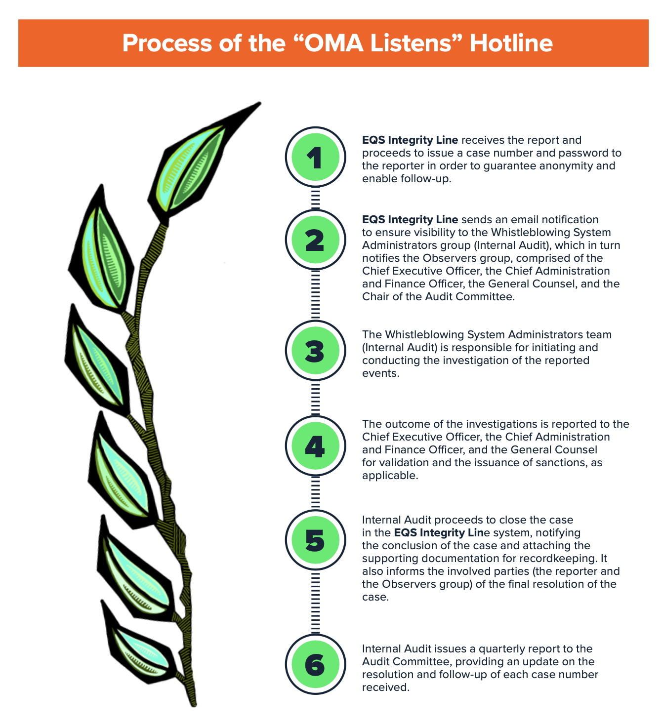 Furthermore, OMA maintains an independent, third-party ethics reporting system administered EQS Integrity Line, internally referred to as “OMA Listens.” This platform enables the confidential and anonymous submission of reports, ensuring that all cases are handled in accordance with established due process.